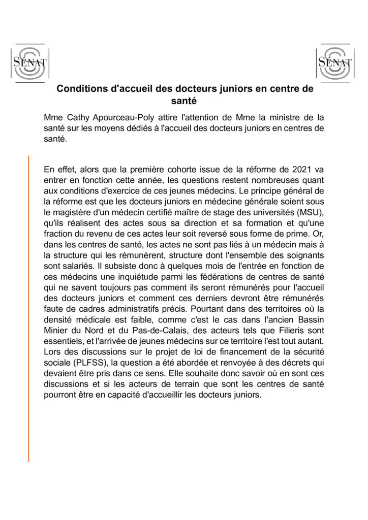 Voici la question que Cathy Apourceau-Poly a posé à la Ministre de la santé, des familles, de l’autonomie et des personnes handicapées relative aux moyens dédiés à l’accueil des docteurs juniors en centre de santé.