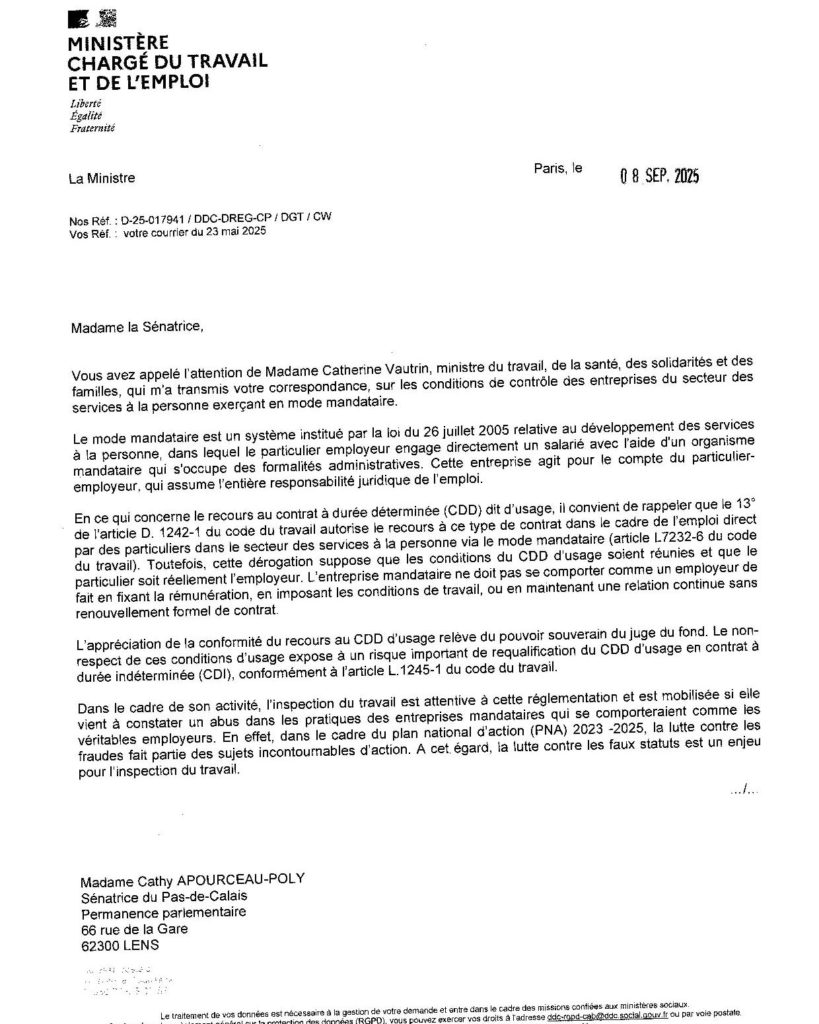 Cathy Apourceau-Poly a reçu la réponse détaillée de Madame la Ministre du Travail sur la situation juridique des employés à domicile.