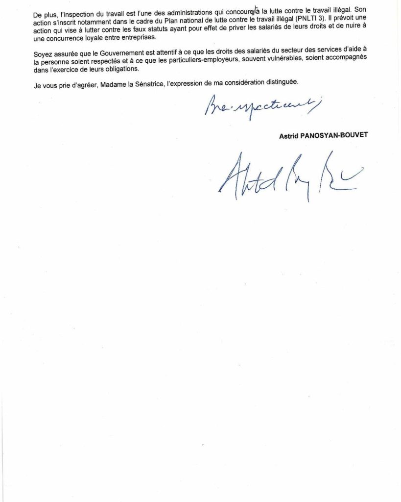 Cette réponse fait suite au courrier commun envoyé avec le sénateur et collègue Jean-Pierre Corbisez, sur le flou autour du mode mandataire dans les services à la personne.