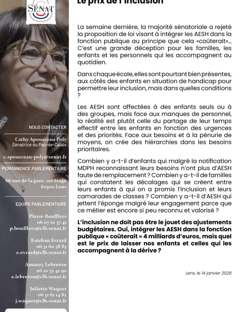 La semaine dernière, le Sénat a rejeté la proposition de loi visant à intégrer les AESH dans la fonction publique à cause du coût de l’opération. C’est donc la reconnaissance implicite que l’accompagnement des enfants en situation de handicap est sous-financé et que les personnels manquent partout.
