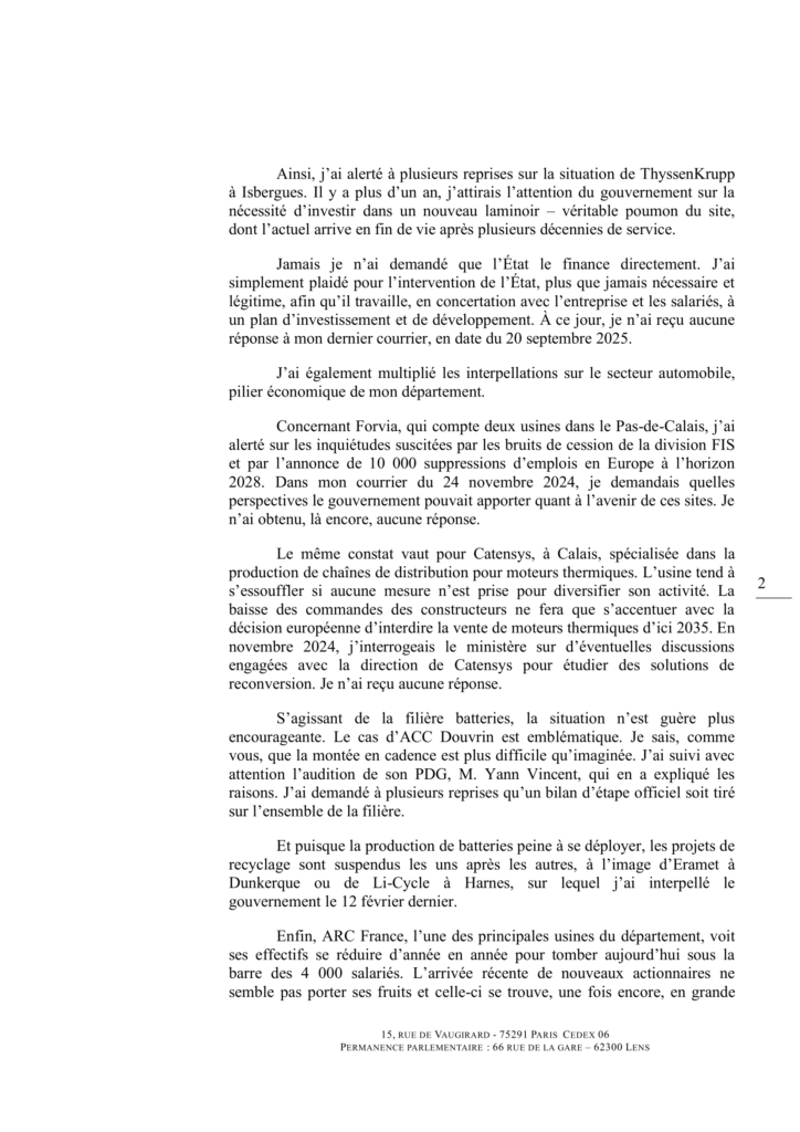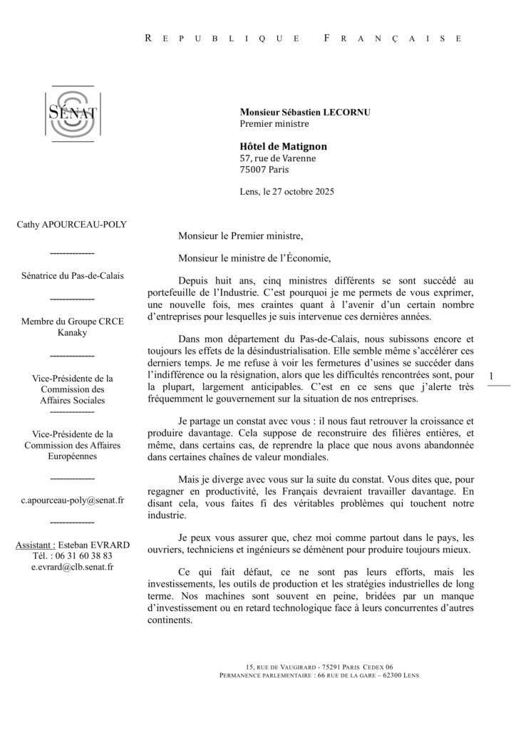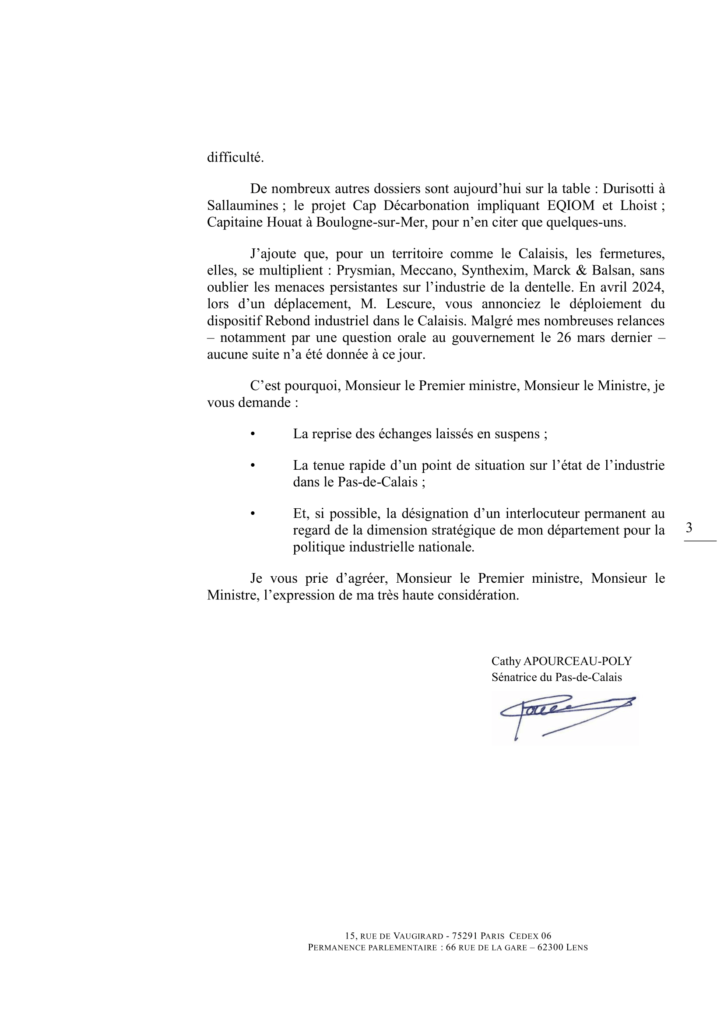 Trop de dossiers industriels restent sans réponse. Ainsi, Cathy Apourceau-Poly a adressé un courrier au Premier ministre et au ministre de l’Économie pour faire le point sur deux ans d’interpellations restées trop souvent lettre morte.