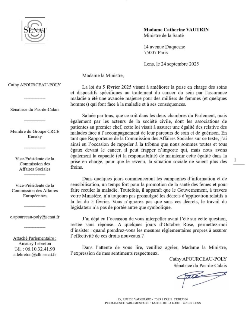 Cathy Apourceau-Poly posera une question orale prochainement à ce sujet et cette dernière invite chacun à retrouver dès maintenant le courrier adressé à la Ministre de la Santé.