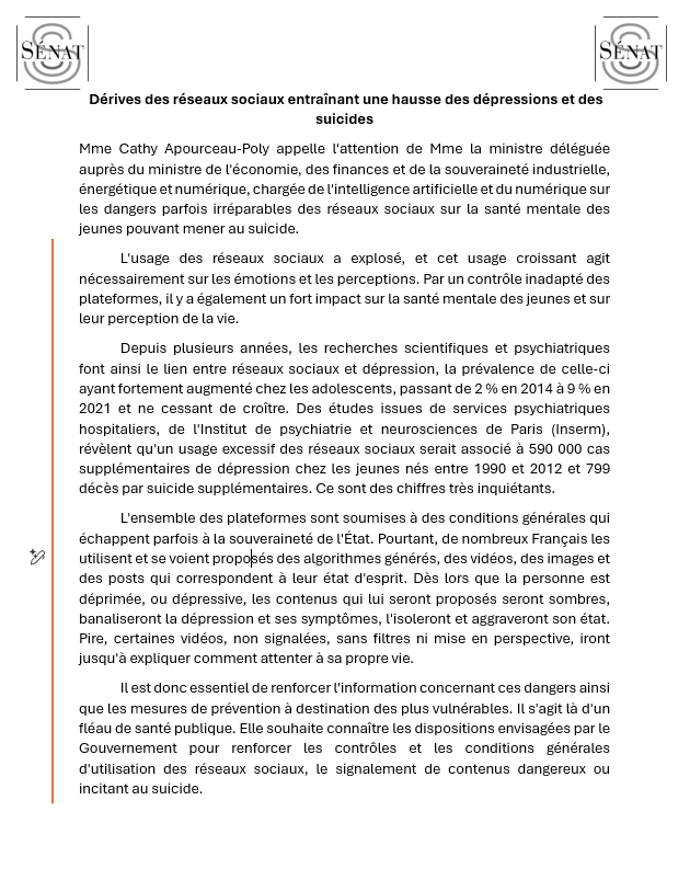 Face aux nombreux témoignages que Cathy Apourceau-Poly a reçu, à l’actualité et aux statistiques de plus en plus inquiétantes, la sénatrice a décidé de rédiger une question écrite au Gouvernement au sujet de l’usage des réseaux sociaux chez les plus jeunes pouvant entraîner un isolement, aggraver leur mal-être et pour certains malheureusement passer à l’acte.