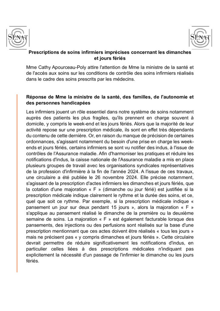 Voici la réponse de la Ministre de la santé, des familles, de l’autonomie et des personnes handicapées suite à la question que Cathy Apourceau-Poly a posé relative aux prescriptions de soins infirmiers imprécises concernant les dimanches et jours fériés publiée le : 26/09/2024.