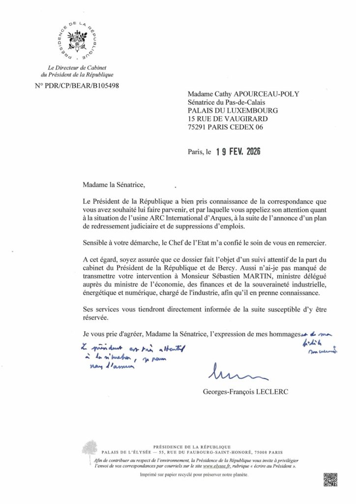 Suite à l’interpellation de Cathy Apourceau-Poly au Président de la République sur la situation extrêmement préoccupante de l’usine ARC International d’Arques, dans le Pas-de-Calais, ce dernier a répondu.