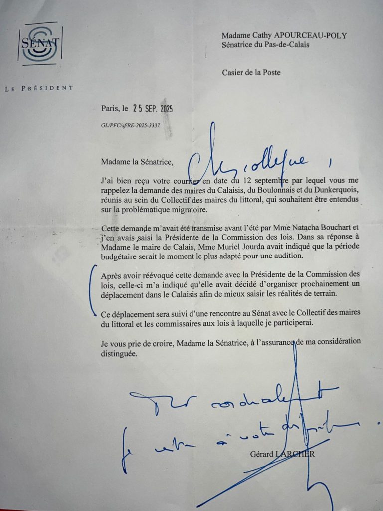 Cathy Apourceau-Poly a reçu la réponse du Président du Sénat, Monsieur Gérard Larcher, rédigée le 25 septembre 2025. En effet, la sénatrice rappelait au Président la demande des Maires du Calaisis, du Boulonnais et du Dunkerquois réunis au sein du Collectif des maires du littoral sur la problématique migratoire. Ces derniers souhaitent être entendus, justifiant le rappel de la sénatrice, et ne sont pas écoutés.